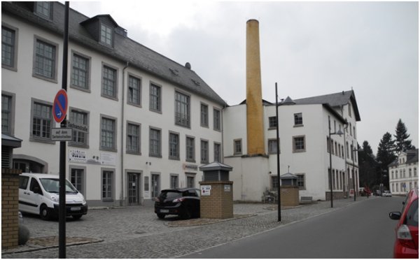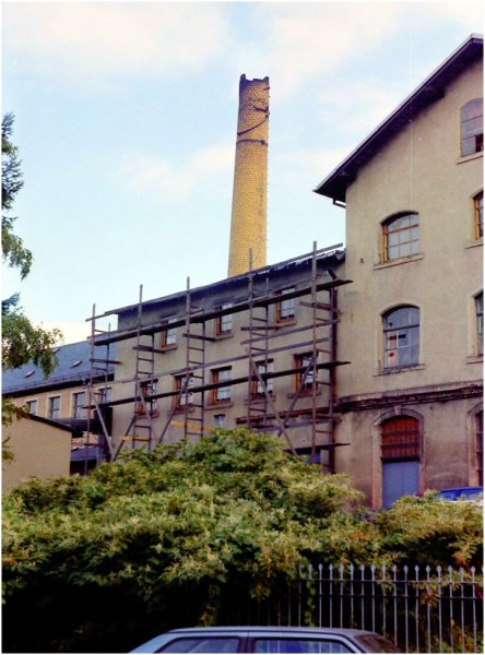 1909 | folgt durch die Firma Paul im Bereich Außenanlagen der Neubau einer Wäscherei und eine Erweiterung des bisherigen Kesselhausanbaues für die Anschaffung eines Wellrohrkessels mit 60 m² Heizfläche. Dieser Bereich Außenanlagen betraf die sehr alten, kleinen Gebäude vor der Fabrik (siehe Bild 3), die in Zustand und Wert nicht erhaltungswürdig waren, als nach 1991 erste Gebäudesanierungen begannen. |