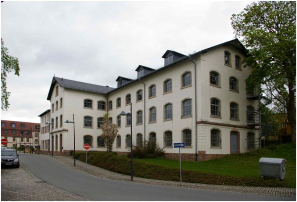 | Diese Technologie änderte sich mit dem ersten, an der Straße gegenüber errichteten Fabrikbau 1853/54. Im nachfolgenden Zeitraum folgte der weitere Ausbau zu dem in Bild 3 in Bildmitte dargestellten Fabrikkomplex. Dieser Fabrikkomplex entstand in 3 Bauabschnitten (in Bild 3 in der Reihenfolge von links nach rechts betrachtet) und enthält die nachstehend beschriebene heutige Nutzung. |