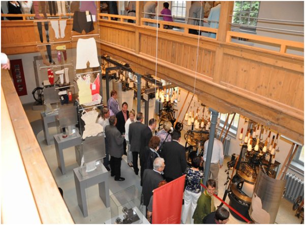 | Hier befinden sich heute u. a. der bemerkenswerte, mit Gußeisenstützen ausgeführte Emporenraum des Esche-Museums und die Ausstellung der Rundwirk- und Rundstrickmaschinen im Transmissionsbetrieb. Im Obergeschoss steht die umfangreiche Sammlung von Handwirkstühlen ab der Zeit 1800, die teilweise vorführbereit und in ihren Spezialitäten auch für Fachinteressenten eine Fundgrube sind. |