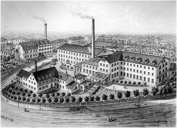 1853/1854 | Gegenüber dem Doppelwohnhaus der Verlagsfirma Reinhold Esche wird der erste Fabrikbau bis einschließlich Schornstein errichtet. Dieser Fabrikbau ist der heutige Ostflügel Sachsenstraße 2 (siehe auch Bild 1), der nicht als Museum genutzt ist. Die Bauherren waren zum damaligen Zeitpunkt die Inhaber Ernst Reinhold Esche (der Sohn Reinhold Esches) und Gustav Fürbringer. |