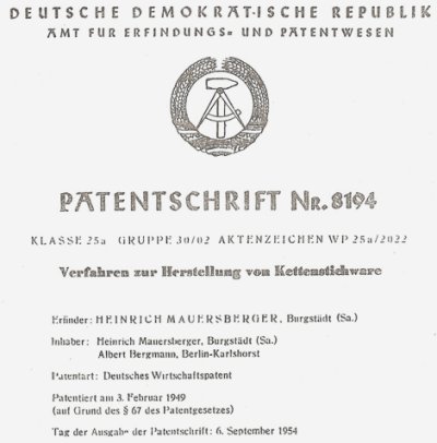 1949 | Das Patent mit dem Titel „Verfahren zur Herstellung von Kettelwebstoff“ hatte Mauersberger am 31.01.1949 fertig formuliert und am 02.02.1949 im DDR-Patentamt hinterlegt. Mit dem Datum 03.02.1949 wurde das Patent WP8194 unter dem neuen Titel „Verfahren zur Herstellung von Kettenstichware“ vom Amt für Erfindungs- und Patentwesen der DDR in der Gruppe der „Vielnadelnähmaschinen“ erteilt. Erst später erfolgte national und international die Eingliederung des Patentes in die Gruppe der „Kettenwirkmaschinen“. Nach mehreren vorläufigen Begriffen wie „Kettelweben“, „Kettenstechen“ oder „Malimieren“ prägte Mauersberger mit Fachkollegen und Patentingenieuren etwa 1953 das neue Wort „Nähwirken“, dass sich schnell weltweit durchsetzte. | |