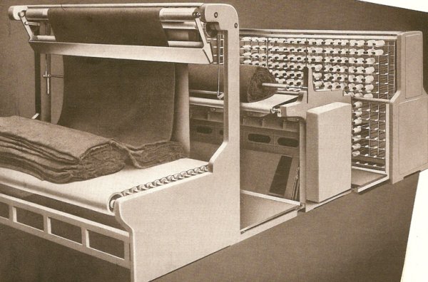 Wirtschaftlichkeitsbetrachtung: Bei 500 Stichen pro min und 2 mm Stichlänge könnte seine hochproduktive Technologie eine Stoffproduktion von 1 m/min bzw. 60 m/h leisten. Demgegenüber lieferte eine Webmaschine damals nur etwa 4 bis 5 m/h Gewebe. | ||