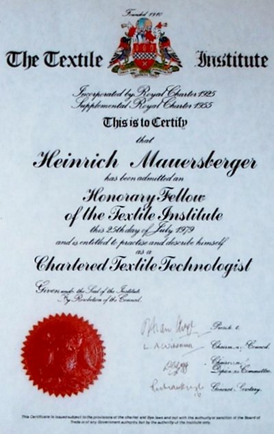 1979 | wurde ihm als zweitem Deutschen die Ehrenmitgliedschaft des Textilinstituts von Manchester (England) verliehen, eine sehr hohe und sehr seltene Auszeichnung. | |