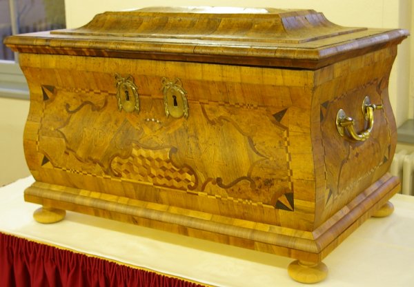 Zur Konfirmation erhält die Innung kostbare Geschenke, beispielsweise ein vergoldetes Handwerksschild von Helena Dorothea von Schönberg zur Kennzeichnung des jeweiligen Versammlungsorts und einen „zienernen Willkommen mit innestehendem Becher“ (ein Humpen für den Ehrentrunk neu eintretender Meister), der mit kostbaren alten Münzen, eingenäht in seidene Bänder, behängt ist. Alles in allem wiegt der „Willkommen“ etwa 10 Pfund. | ||