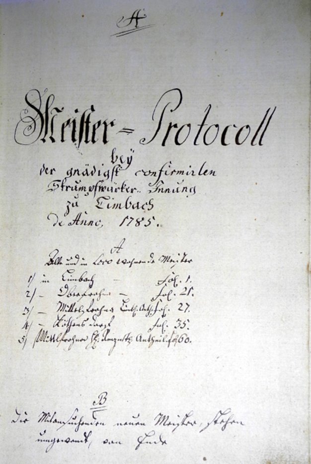 1785 | Nach 5 Jahren kann am 25.02. endlich die Konfirmation (Bestätigung) der Innung erfolgen. Diese Limbacher Strumpfwirkerinnung ist eine der ersten Handwerkerinnungen, die einer Dorfgemeinde gestattet werden. Innungsrechte können seit dem Erlass der Generalinnungsartikel 1780 auch Dörfern erteilt werden, zuvor nur Städten. Limbach als bereits starker Wirkereiort erfüllt dafür die Voraussetzungen. | |