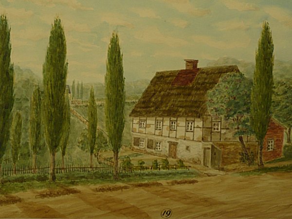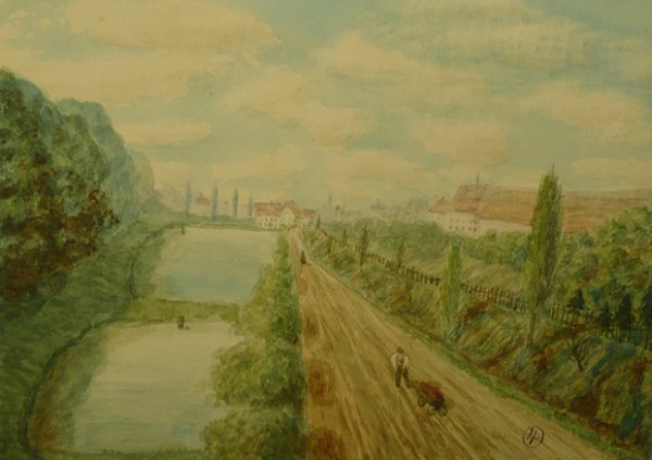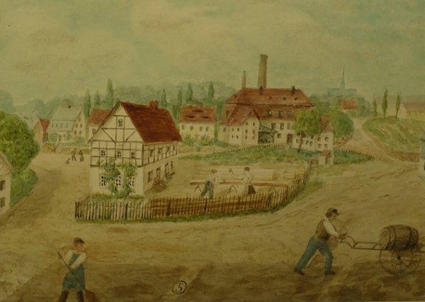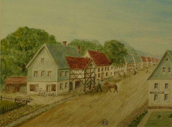 Die Skizzen werden später auf extra in New York gekauften Bogen zu prächtigen Aquarellen. Hier seien nur ein paar der wunderschönen Bilder erwähnt: die Helenen- und die Dorotheenstraße, der Marktplatz, die Kirche, der alte Friedhof, der Johannisplatz, der Kellerberg und viele der zahlreichen Teiche, die es Mitte des 19. Jahrhunderts in Limbach noch gab. | ||