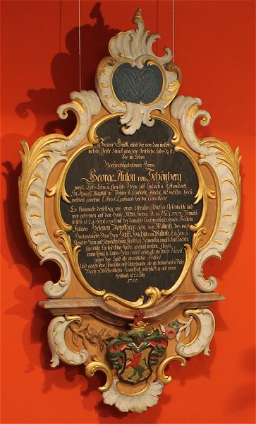 Geborgen wurde die historische Tafel seinerzeit für die Sonderausstellung „500 Jahre Stadtkirche“. Sie war in einem beklagenswerten Zustand. Es hat viel Arbeit gemacht, das Epitaph für Georg Anton von Schönberg zu retten, schon die Bergung, die vor allem der Aktivität von Wolfgang Ziemert zu danken ist, war nicht einfach, die Organisation der Dauerleihe für die Stadt aufwendig. Und schließlich musste Geld beschafft werden für die Restaurierung. Wir erbaten bei den Veranstaltungen im Rahmen der Vortragsreihe des Vereins Spenden für das Epitaph. Aber Stadtkämmerer Carsten Schmidt hatte bei der Finanzplanung 2013 schon gut vorgesorgt und eine Fördermöglichkeit für die Finanzierung des kostbaren Stückes gefunden.