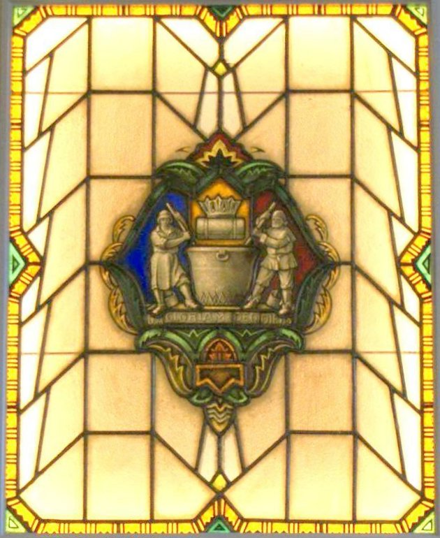 Im Foyer des Esche-Museums überraschen den Besucher seit kurzer Zeit zwei Buntglasfenster zum Thema "Textilveredlung". Ein Motiv (Bild 1) zeigt gefärbte Garnstränge, die zum Trocknen aufgehängt sind, auf dem anderen (Bild 2) sind zwei Arbeiter abgebildet, die Stoff im Färbebottich bearbeiten. Bleiglasfenster waren im Hochmittelalter nur für Kathedralen und Kirchen gebräuchlich, ehe sie im ausgehenden Mittelalter in Schlössern und Adelssitzen Einzug hielten.
