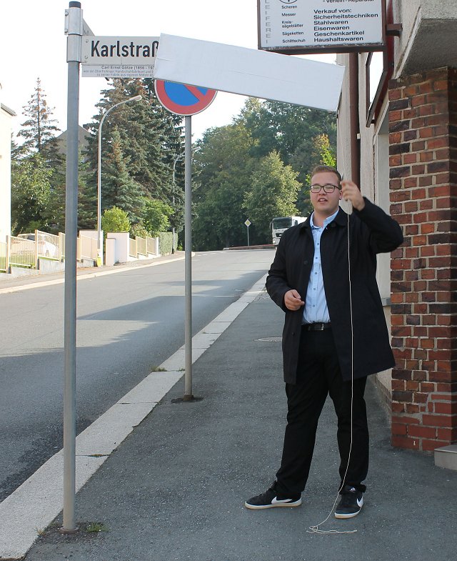 Die Karlstraße erhielt ihren Namen zu Ehren des Unternehmers Carl Götze, der 1880 dort eine Textilfabrik errichtete. Die Initiative für das Zusatzschild ging von Marvin Müller aus, der vor einiger Zeit die Firmengeschichte aufgeschrieben hat (vgl. auch Geschichte(n) / Firma Carl Götze Oberfrohna).Das Stück Straße zu seiner Fabrik musste der Unternehmer selbst finanzieren, daher wurde sie auch nach ihm benannt.