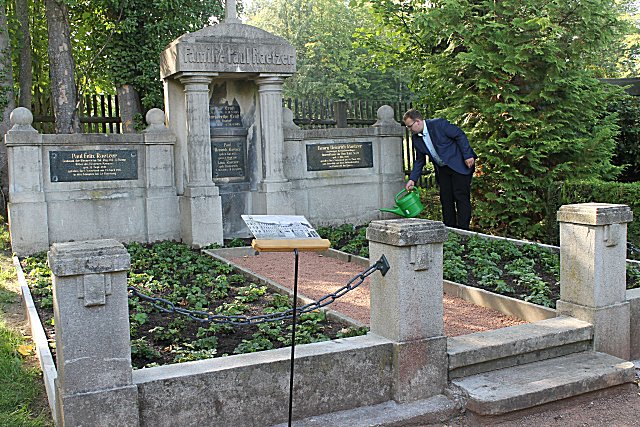 Ende 2018 haben wir mit der Restaurierung des Grabmals begonnen. Dabei war uns eine Spende der fünf Firmen von dem Fertigungsnetzwerk der Firmengruppe Delta Barth Anregung für die weitere Arbeit und eine große Hilfe. Das Geld reichte für die Erneuerung der beiden seitlichen Namenstafeln. Für die noch fehlenden Summen warben wir Spenden ein, auch von unseren Mittgliedern.